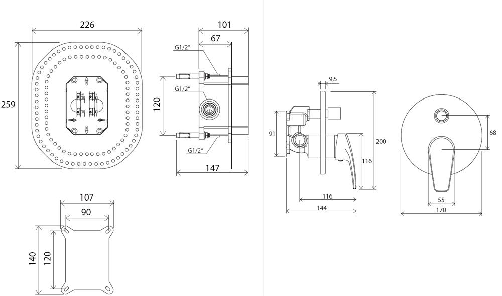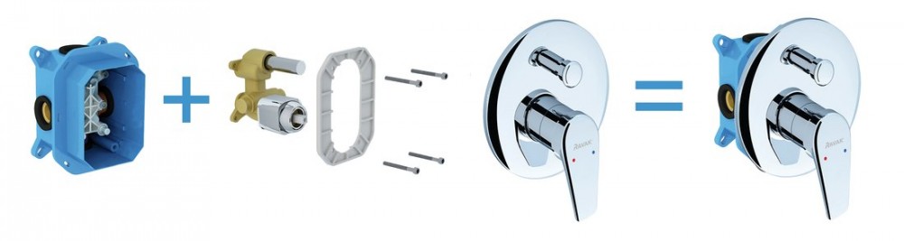 - R-box складається з пластикової основи і нижньої частини змішувача прихованого монтажу, виготовленої з латуні
