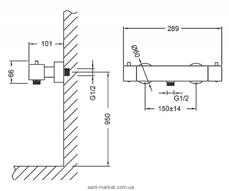 Змішувач для душу настінний двухвентильний з термостатом Kraus хром UKR-46039