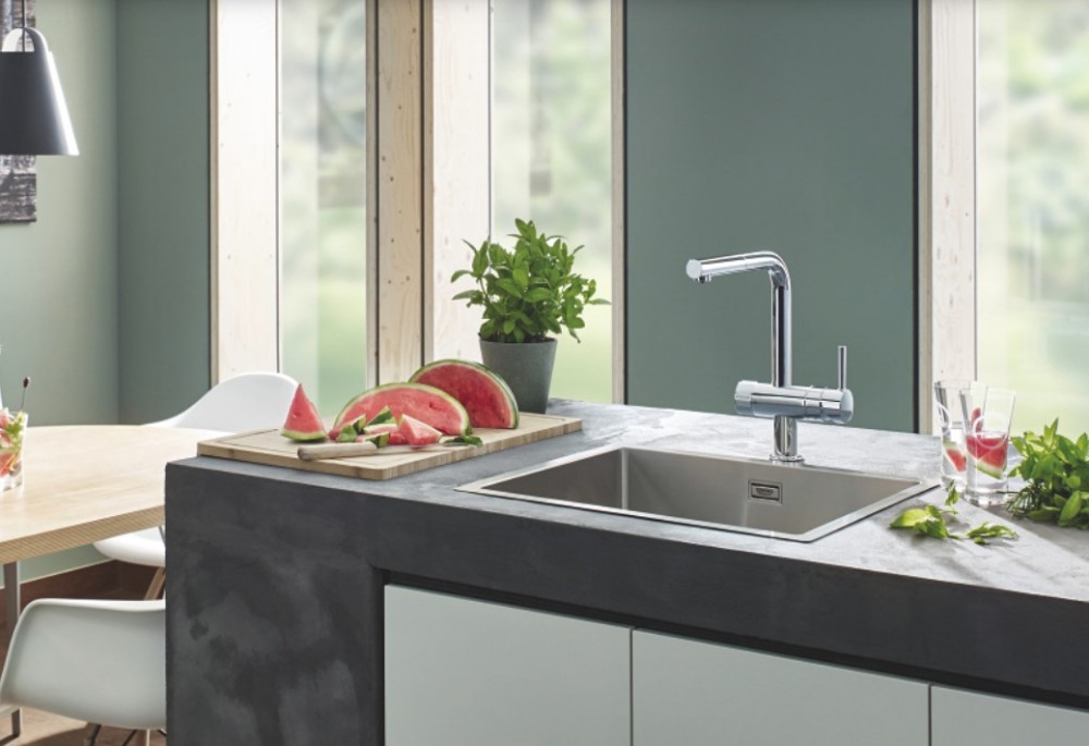 В кухонному змішувачі GROHE Blue Minta Pure поєднуються функції звичайного змішувача для мийки та системи фільтрації води.