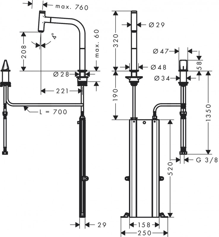 - короб sBox для тихого, плавного, безпечного переміщення шланга в кухонній шафі, під стільницею; подовження шланга - до 76 см