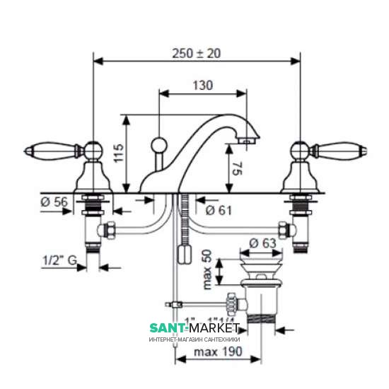 Змішувач для раковини Двохважеля прихований з донним клапаном EMMEVI Deco Ceramic хром CR121033
