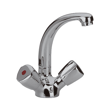 Двовентильний змішувач Kludi Standard 210350515 для умивальника має близьку до класики конструкцію, яка не тільки приваблива, а й зручна у використанні. Змішувач Клуді Стандарт 210350515 оснащений високим зливом з масивними контурами. На вилив змішувача є аератор. Устаткування доповнене скобою для фіксації ланцюжка. Змішувач Kludi Standard 210350515 має витрату води класу А. Виріб встановлюється на один отвір за допомогою жорсткого підведення. Вентилі управління дбайливо доповнені виробником маркуванням синього та червоного кольору.