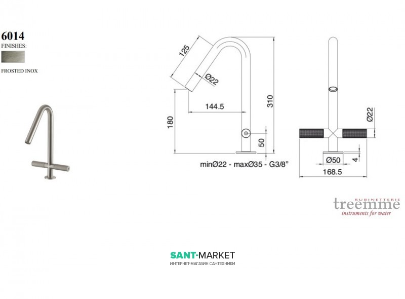Змішувач для раковини двухвентильний Treemme 22mm нержавіюча сталь 6014IS