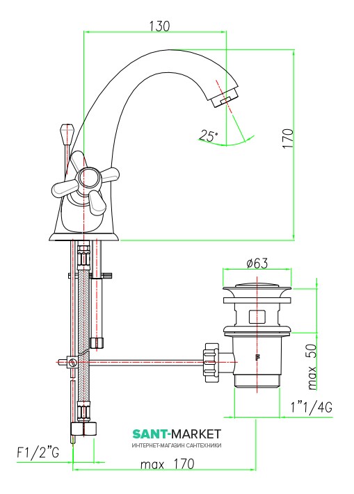Змішувач для умивальника у ретро стилі, з високим виливом у комплекті з гнучким підведенням та донним клапаном.