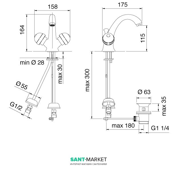 Змішувач для раковини двухвентильний з донним клапаном Treemme Basetta хром 3414 CC