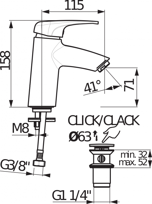 1) Змішувач для раковини Jika Deep з донним клапаном хром