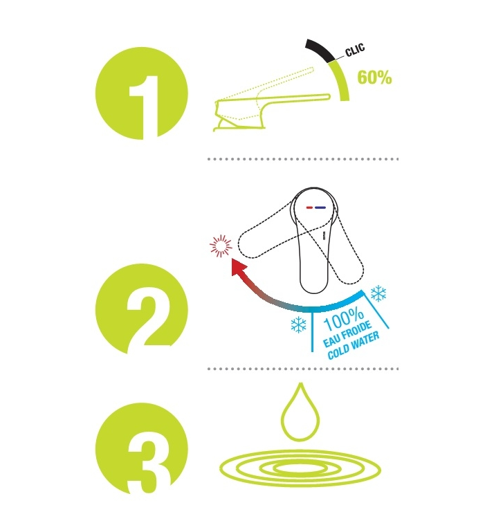 Відкриття холодною водою у середній позиції важеля, уникаючи непотрібного споживання гарячої води.