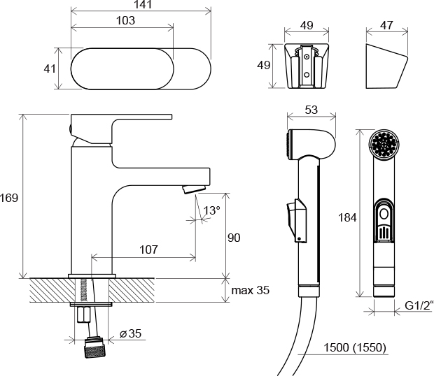 Змішувач з гігієнічним душем може бути виведений з настінного вентиля, не вимагає підключення до умивальника і змішувача до нього. Підходить для комбінації зі змішувачем прихованого монтажу.