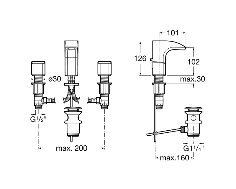 Змішувач двохвентильний на 3 отвори з донним клапаном, колір хром.