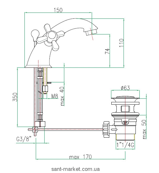 Змішувач для умивальника в ретро стилі, з високим виливом, в комплекті з гнучким підведенням та донним клапаном.