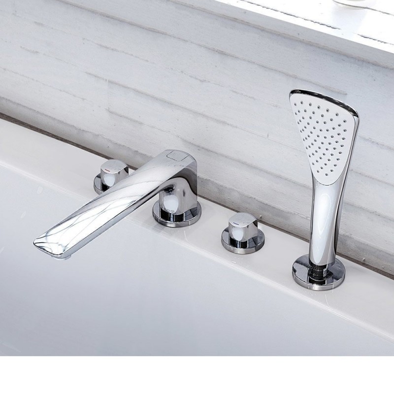 Тип змішувача на чотириотвори є виразний комплект для установки на борт ванн і включає в себе вентилі для регулювання, виливши і душ, сприяючи комфорту. Дану модель можна встановити на борт ванни. Тип установки змішувача на борт ванни підходить для оформлення просторих санвузлів, додаючи оригінальності інтер'єру і надаючи естетичності стилістичним композиціям.