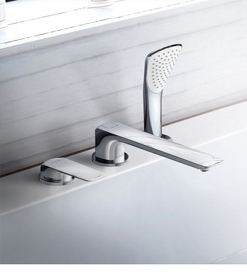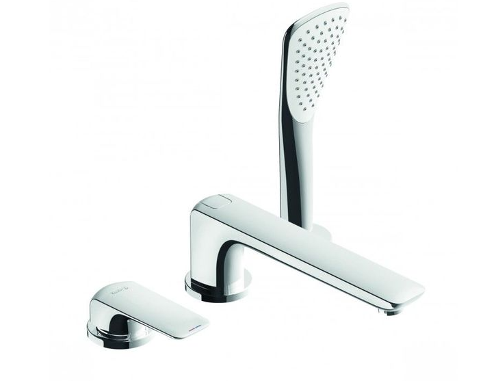 Типзмішувача на три отвори є виразний комплект для установки на борт ванн і включає в себе важіль для регулювання, виливши і душ, сприяючи комфорту. Дану модель можна встановити на борт ванни. Тип установки змішувача на борт ванни підходить для оформлення просторих санвузлів, додаючи оригінальності інтер'єру і надаючи естетичності стилістичним композиціям.