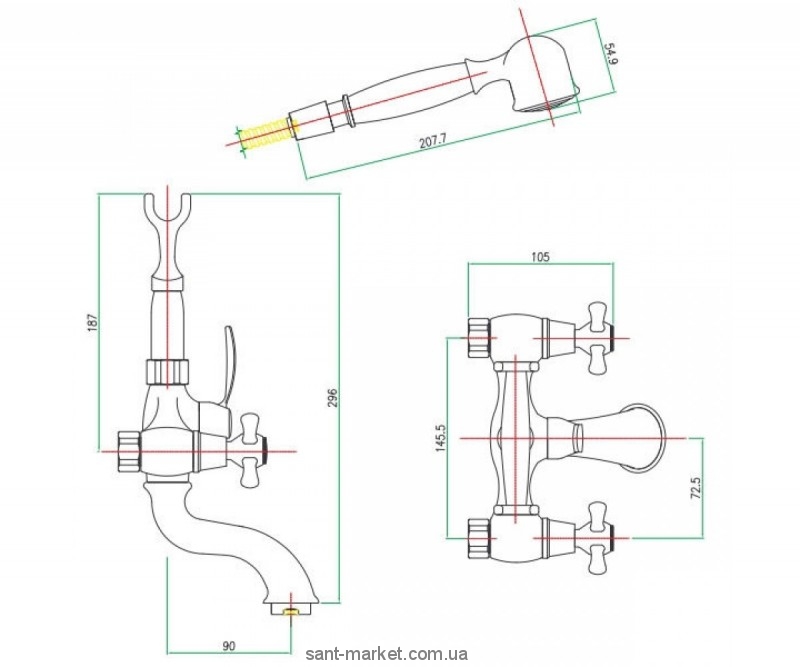 Змішувач для ванни в ретро стилі, в комплекті з шлангом і ручним душем, підставка на змішувачі