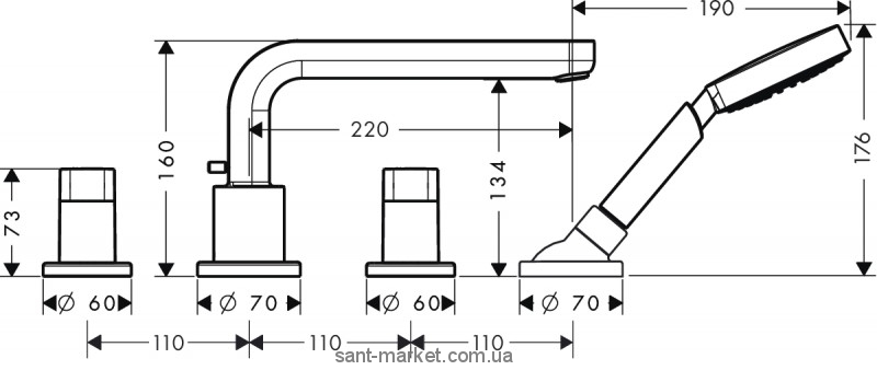 рукоятки, виливши на ванну, ручний душ, шланг 1100 мм