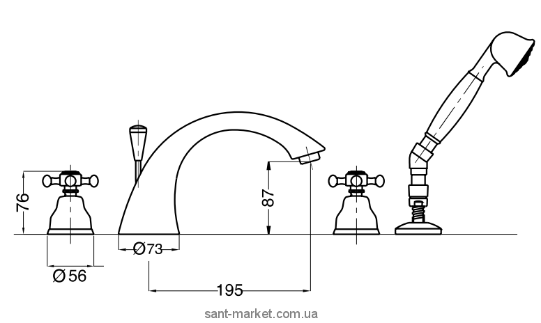 Центральним елементом конструкції цього змішувача для ванни є витончено вигнутий кран, що плавно потовщується у підстави. Також поблизу основи крана, у верхній частині, присутній невеликий конусовидний перемикач з крана на душ. Сопло крана трохи скошене, що дає додаткові зручності при його використанні. У комплект змішувача входять і дві хрестоподібні ручки-вентилі для регулювання подачі гарячої та холодної води.