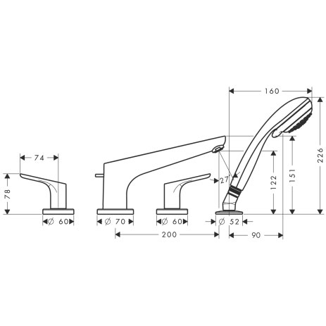 Змішувач двохвентильний на борт ванни з душем Hansgrohe колекція Focus E2 хром 31936000