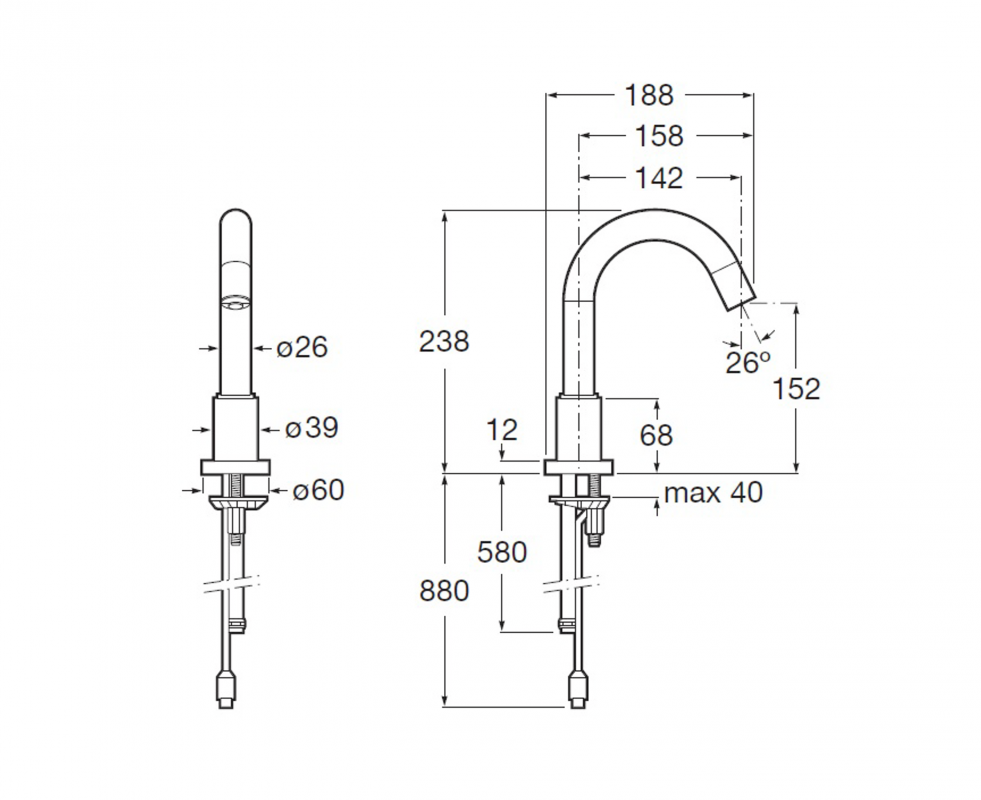 1) Змішувач електронний для раковини Roca Loft-E з блоком попереднього змішування води