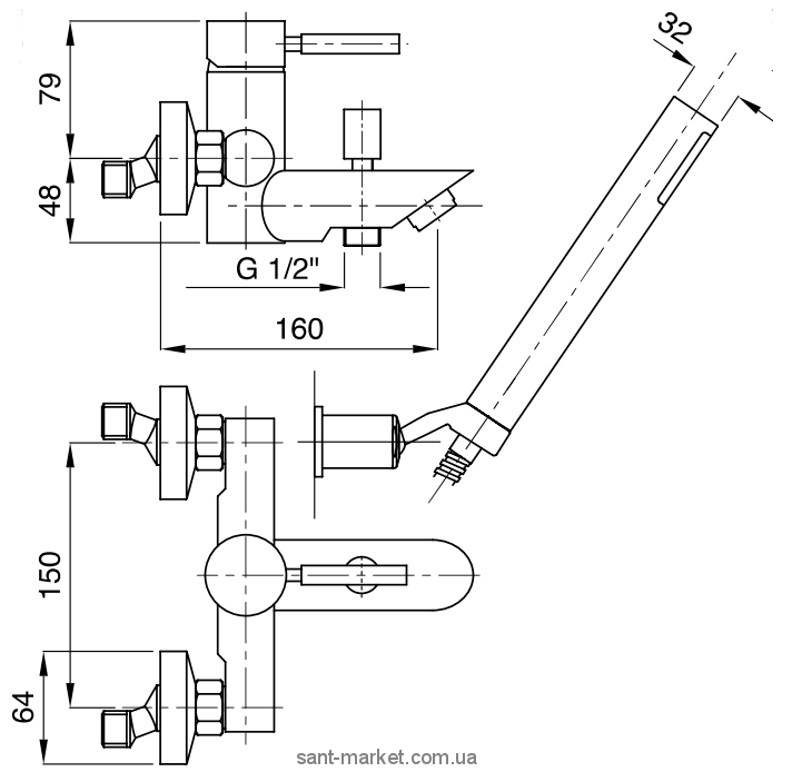 З його тильного боку в протилежних кінцях розташовано два дископодібні елементи, за допомогою яких змішувач монтується до стіни. У комплект даного змішувача також входить ручний душ, що має правильну циліндричну форму, з розташованими на ньому отворами для подачі води, що займають приблизно чверть верхньої бічної поверхні ручки. Крім того, в комплекті є настінний тримач для душу у формі витягнутого циліндра.