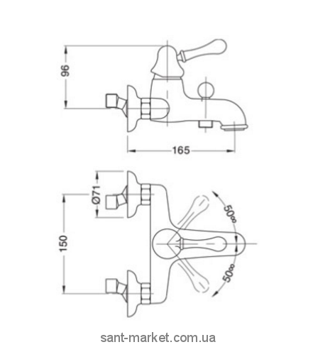 Конструкція представленого змішувача цільнолита. Центральним її елементом є ґрунтовний, що загинається біля самого носика кран. У середній частині зверху розташовується кулястий перемикач з крана на душ, а знизу – вихід для підключення шланга до душу. Основа крана зверху переходить у вертикальну дзвоноподібну ручку для регулювання подачі гарячої та холодної води, яка забезпечена нахиленим вперед великим важелем витягнутої краплеподібної форми. Від боків крана плавно відгалужуються два горизонтальні трубкоподібні елементи, до країв яких приєднані два круглі тарілкоподібні кріплення, за допомогою яких змішувач монтується в стіну. Загальна довжина конструкції (від стіни) трохи перевищує 17 см, ширина (між кріпленнями) – 15 см.