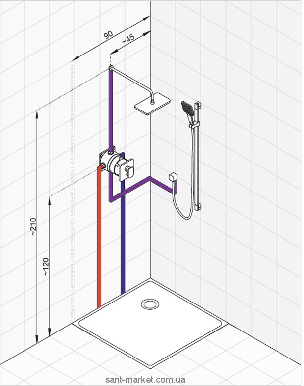 змішувач, декоративна накладка, рукоятка, функціональний елемент з керамічним картриджем, з обмежувачем гарячої води, автоматичне перемикання душ / ванна.