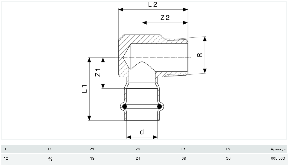 1) Угольник переходной 90° Viega Prestabo 1114.1 12хR3/8 нелегированная сталь