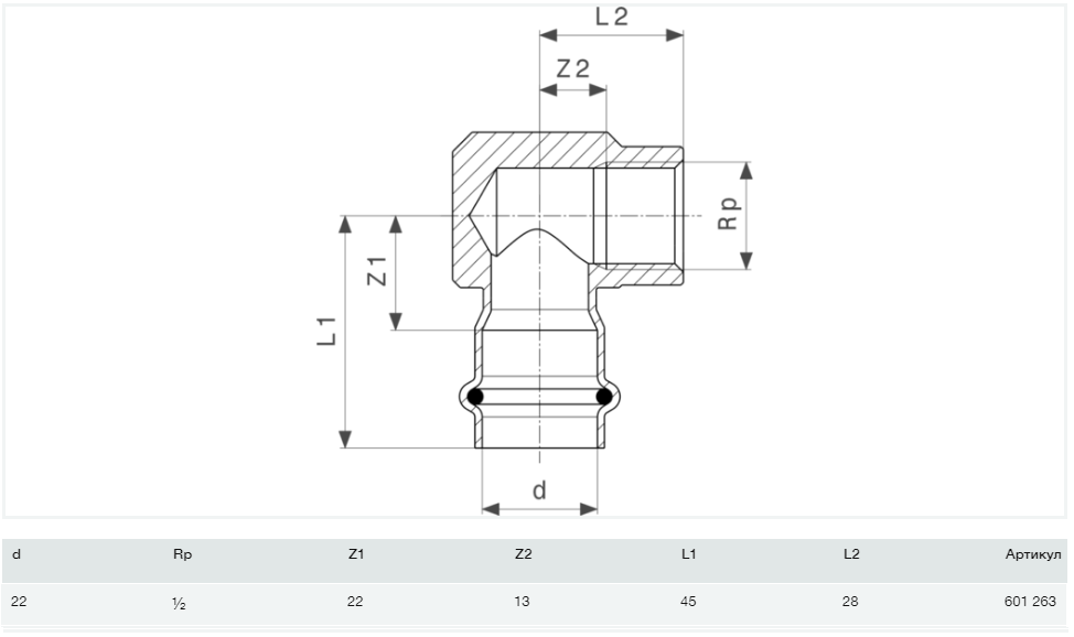 1) Угольник переходной 90° Viega Prestabo 1114.2 22хRp1/2 нелегированная сталь