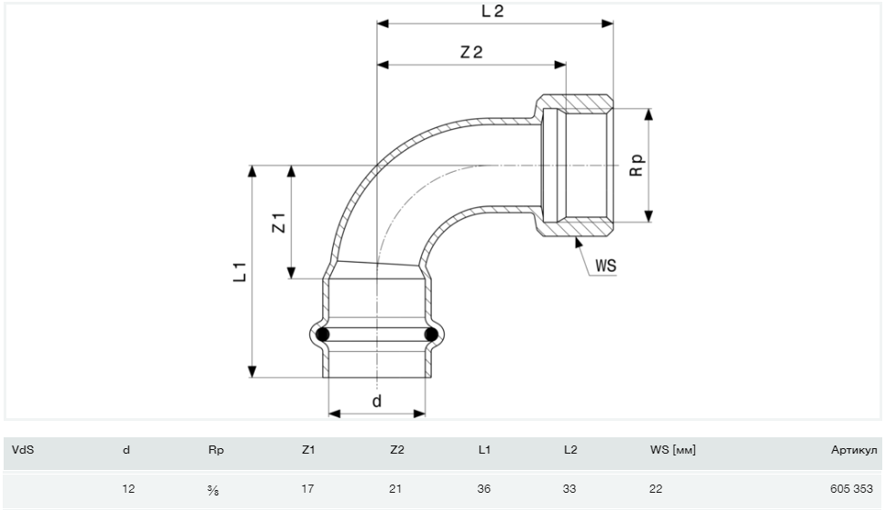 1) Угольник переходной 90° Viega Prestabo 1114.5 12хRp3/8 нелегированная сталь