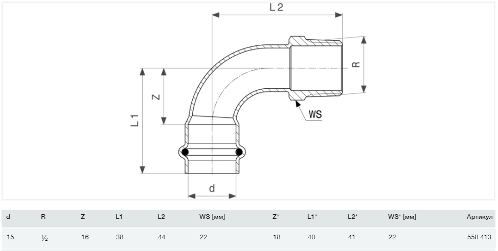 1) Угольник переходной 90° Viega Prestabo 15хR1/2 нелегированная сталь