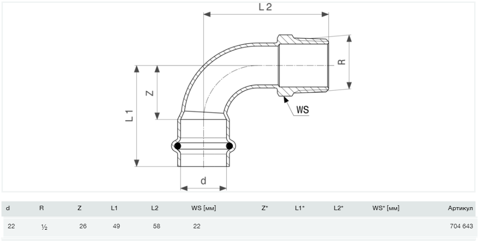 1) Угольник переходной 90° Viega Prestabo 22хR1/2 нелегированная сталь