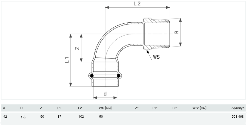 1) Угольник переходной 90° Viega Prestabo 42хR1 1/2 нелегированная сталь