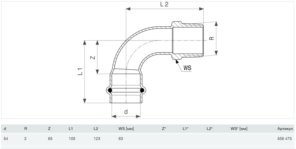 1) Угольник переходной 90° Viega Prestabo 54хR2 нелегированная сталь