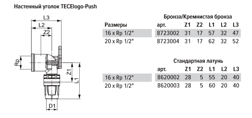 Уголок TECE TECElogo-Push с настенным креплением 16xRp 1/2'' бронза/кремниевая бронза 8723002