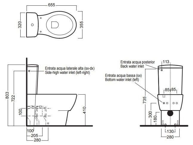 Моноблочный унитаз с универсальным сливом для пристенной установки. U крепления. Может комбинироваться с сиденьем с механизмом плавного опускания или без него. Должен быть дополнен смывным бачком с боковым верхним, нижним или задним подводом воды.