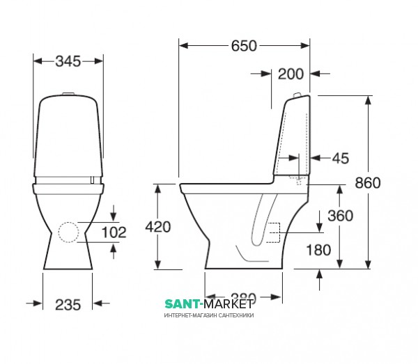 Унитаз со скрытым горизонтальным выпуском от компании Gustavsberg. Выполнен из сантехнического фарфора белого цвета, в современном стиле. Имеет экономичный двойной смыв объёмом 3/6 литров. Также может быть оборудован жёстким сиденьем из белого пластика с функциями лёгкого снятия и микролифта.