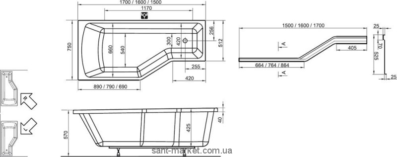 Ванна акриловая асимметричная Ravak Be happy 170х75х61 R C171000000