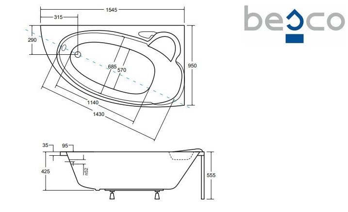 Ванна акриловая Besco Finezja Nova 155х95 см правосторонняя глянцевый белый
