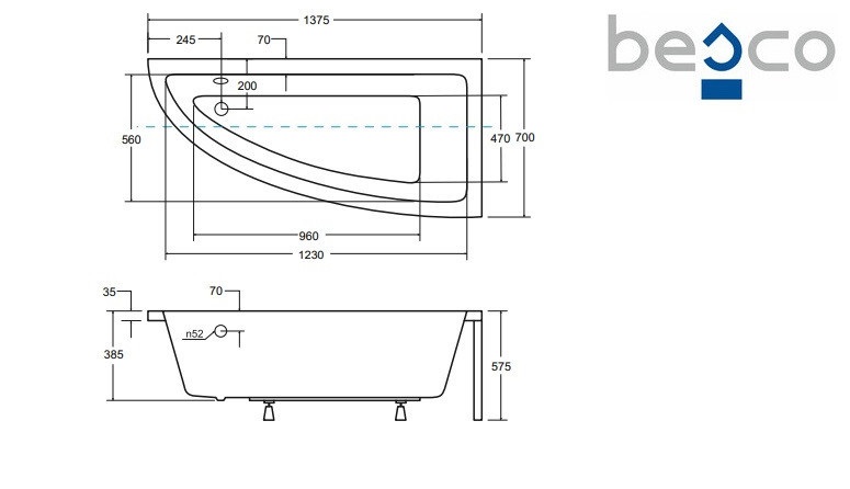 Ванна акриловая Besco Praktika 150х70 см правосторонняя глянцевый белый