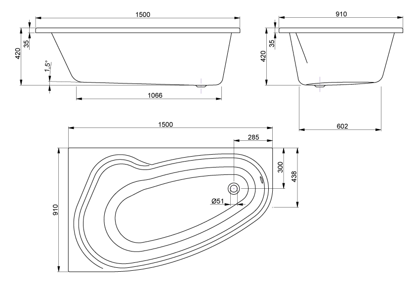 1) Ванна акриловая Devit Aurora 150х90 см левая угловая белый