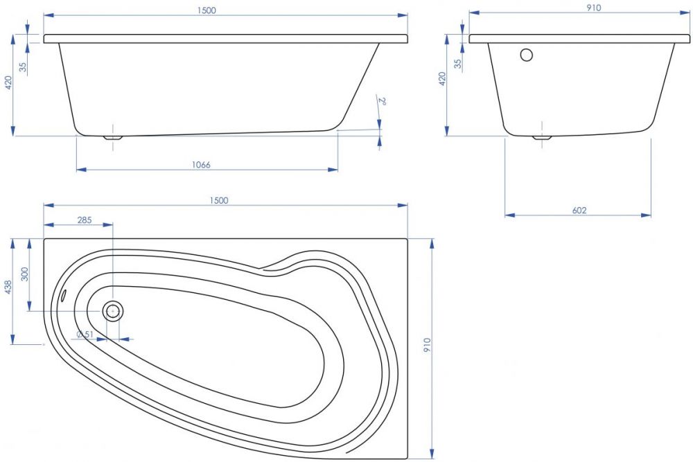 1) Ванна акриловая Devit Aurora 150х90 см правая угловая белый