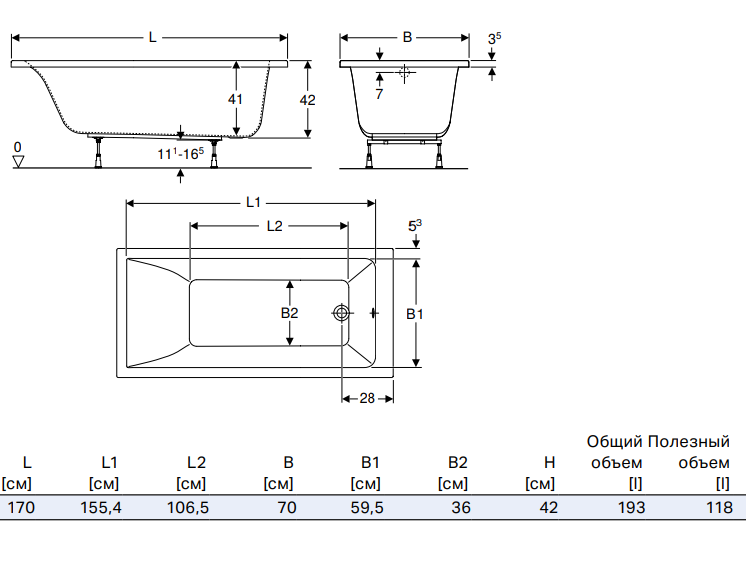 Ванна акриловая Geberit Renova Plan 170х70 с ножками белый