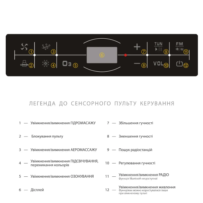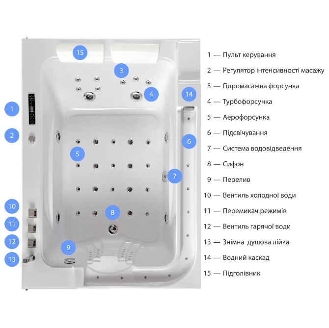 гидромассаж, аэромассаж, массаж спины, регулятор интенсивности массажа, озонатор, радио, подголовники слева, электрический предохранитель, выдвижная душевая лейка, управление сенсорное, врезной смеситель