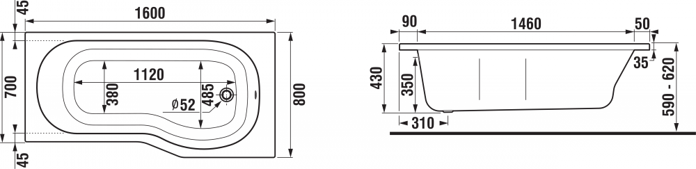 Ванна акриловая Jika Tigo 160х80 см асимметричная встраиваемая правая H2202100000001