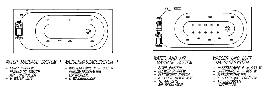 Cистема гидромассажа работает таким образом: водяной насос создает давление и приток воды через массажные сопла, которые направляют струю воды смешанную с воздухом. Тысяча воздушных шариков с большой скоростью воды интенсивно массируют человека. Приток воды контролируется отмеренным поступлением воздуха в массажные форсунки.