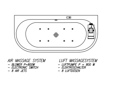 Ванна из литьевого сантехнического акрила с одной внешней стороной и классическими овальными линиями, для пристенной установки. Панель интегрирована в корпус ванны. Ванна с установленной системой воздушного массажа.