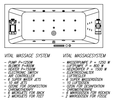 Собранная ванна на каркасе со сливом-переливом с установленной панелью и массажной системой VITAL.