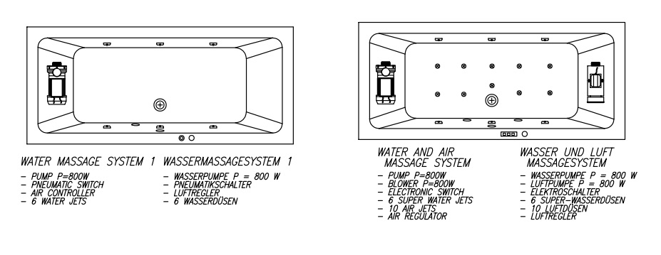 Cистема гидромассажа работает таким образом: водяной насос создает давление и приток воды через массажные сопла, которые направляют струю воды смешанную с воздухом. Тысяча воздушных шариков с большой скоростью воды интенсивно массируют человека. Приток воды контролируется отмеренным поступлением воздуха в массажные форсунки.