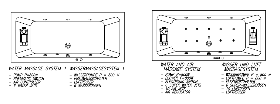 Cистема гидромассажа работает таким образом: водяной насос создает давление и приток воды через массажные сопла, которые направляют струю воды смешанную с воздухом. Тысяча воздушных шариков с большой скоростью воды интенсивно массируют человека. Приток воды контролируется отмеренным поступлением воздуха в массажные форсунки.