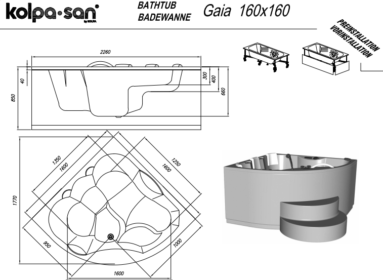 1) Ванна акриловая Kolpa San Gaia 160х160 см гидромассажная со встроенным смесителем и панелью белый