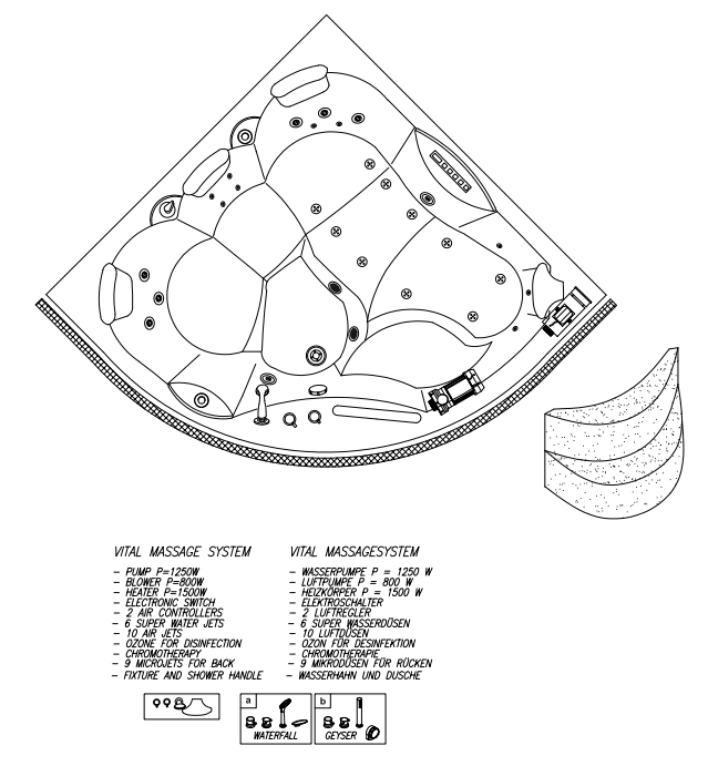 с массажной системой VITAL, с системой MIKRO (массаж спины), со встроенным однорычажным смесителем для ванны Waterfall с ручным душем, с фронтальной панелью