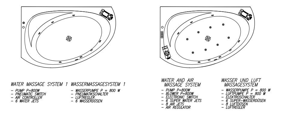 Cистема гидромассажа работает таким образом: водяной насос создает давление и приток воды через массажные сопла, которые направляют струю воды смешанную с воздухом. Тысяча воздушных шариков с большой скоростью воды интенсивно массируют человека. Приток воды контролируется отмеренным поступлением воздуха в массажные форсунки.